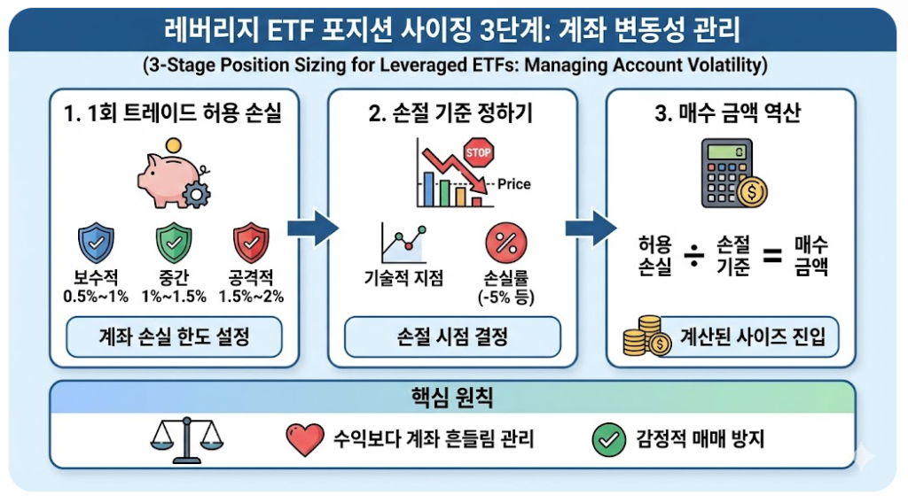 레버리지 ETF는 방향 예측보다 계좌 변동성 통제가 더 중요할 때가 많습니다. 초보에게 가장 좋은 규칙은 “간단하고 반복 가능”한 규칙입니다.