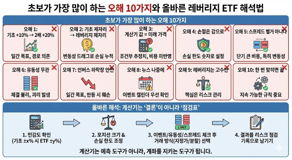 레버리지 ETF는 구조를 모르면 심리적으로도 위험합니다. 저는 초보가 하는 실수를 “지식 부족”보다 “잘못된 기대”에서 더 많이 봅니다. 아래 10가지를 읽고, 계산기를 쓰는 방식 자체를 바꿔보세요. 그 순간부터 레버리지 ETF는 훨씬 통제 가능한 도구가 됩니다.