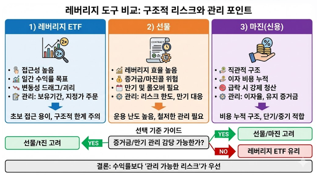 레버리지 ETF vs 선물 vs 마진: 같은 레버리지라도 리스크가 다른 이유와 선택 기준
